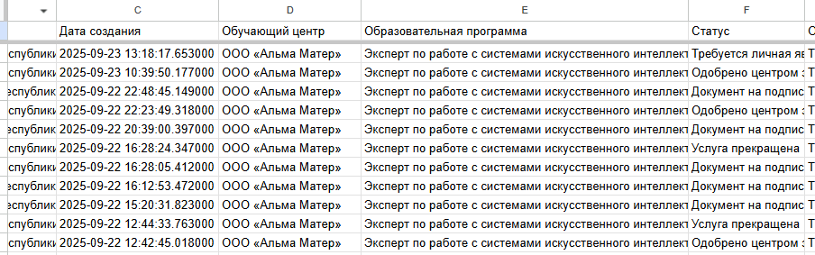 - Проблема Образовательное учреждение сталкивалось с необходимостью ручного сбора и обработки данных о заявках на различные программы обучения. Сотрудники тратили значительное время на мониторинг образовательных платформ, ручное составление отчётов по статусам заявок, отслеживание операторов и периодов обучения. Это приводило к задержкам в обработке лидов, неэффективному распределению ресурсов и потере потенциальных студентов.